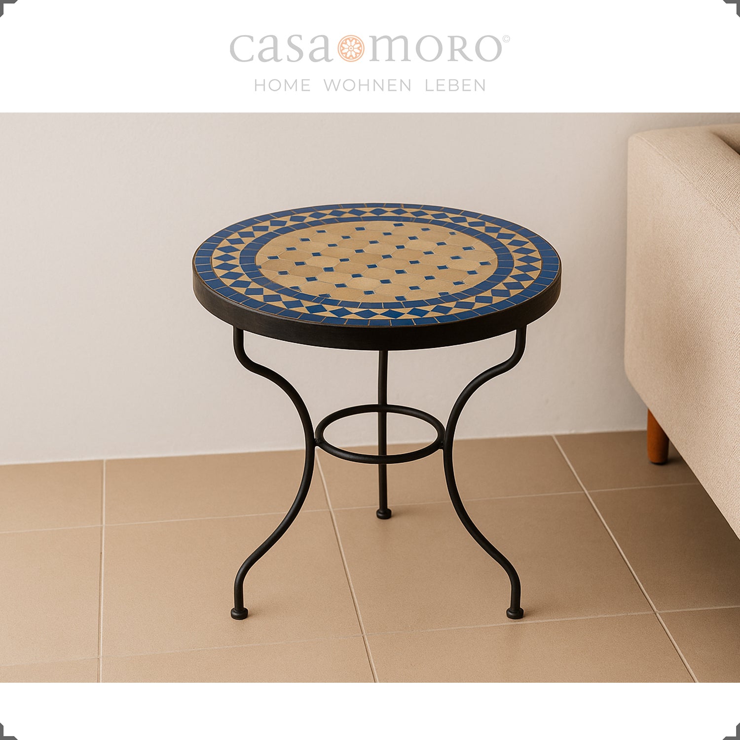 Cette petite table de 45 cm de diamètre est très polyvalente : elle peut servir de table pour plantes dans le salon, de petite table d'appoint sur le balcon ou de table en mosaïque pour le coin cuisine. Le motif Zellige en bleu-terre cuite apporte une touche méditerranéenne à tous les intérieurs.