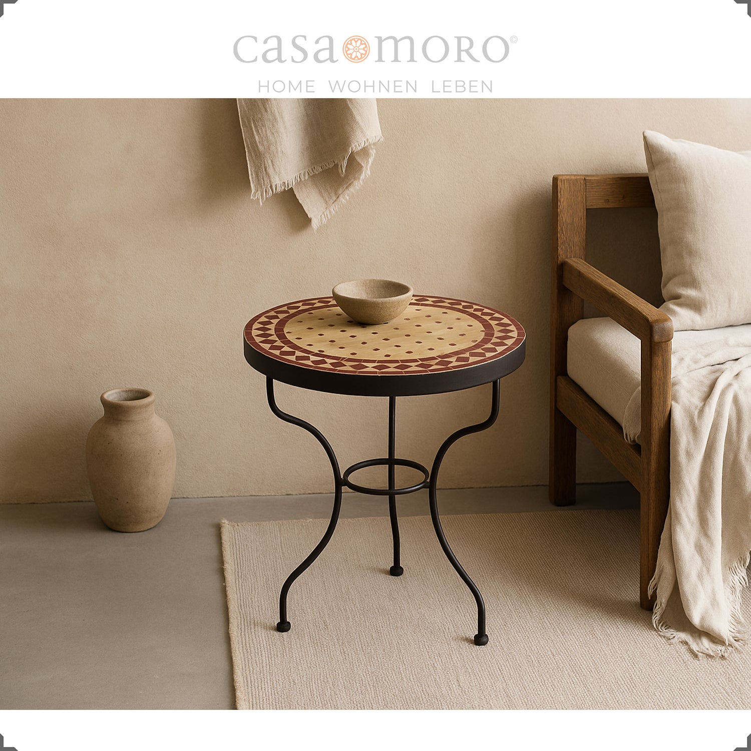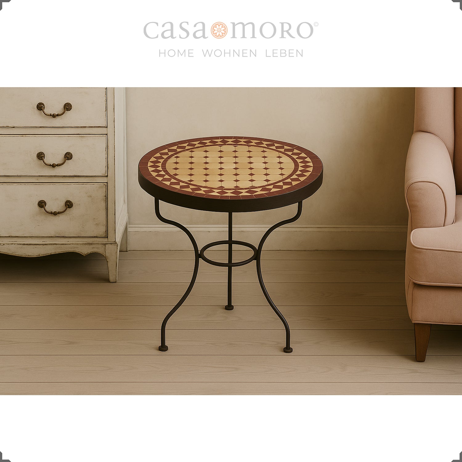Que ce soit comme table d'appoint étroite dans un coin de la cuisine, comme table élégante pour vos plantes sur la terrasse ou comme table décorative de style bohème méditerranéen, cette table en mosaïque s'intègre parfaitement dans les intérieurs classiques marocains, urbains et naturels ou d'inspiration rétro.