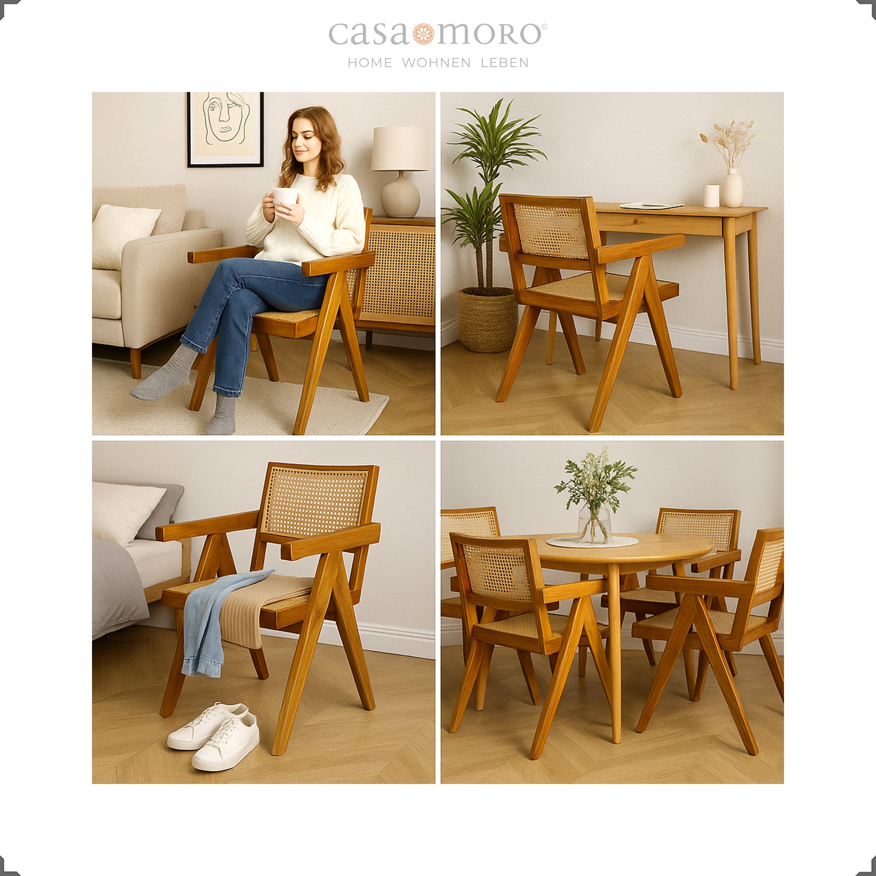 Notre fauteuil Nico en teck massif et rotin naturel est entièrement fabriqué à la main. La combinaison de la forme rectiligne et de l'assise et du dossier larges tressés à la main en rotin naturel véritable garantit un grand confort d'assise, une bonne stabilité et une longue durée de vie.