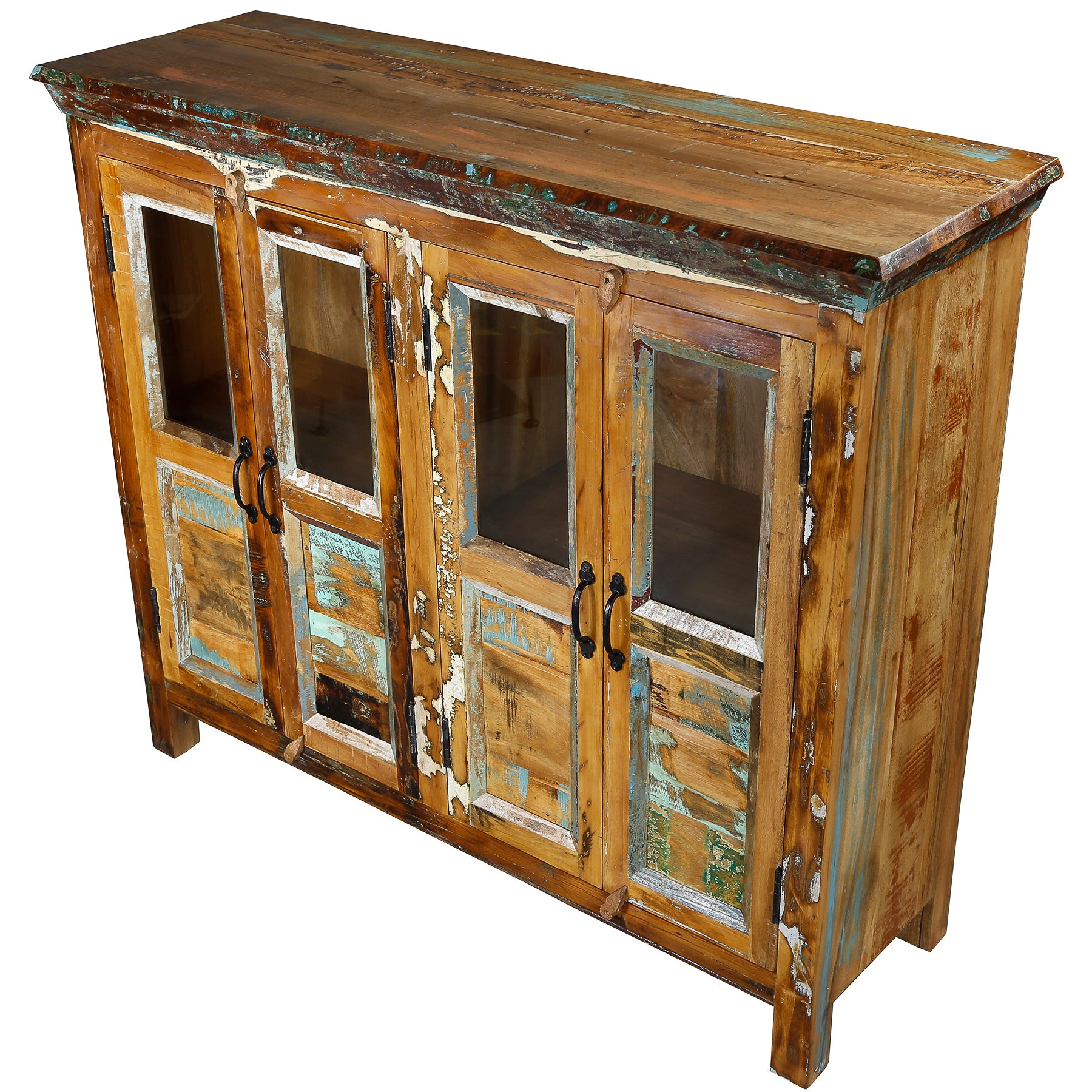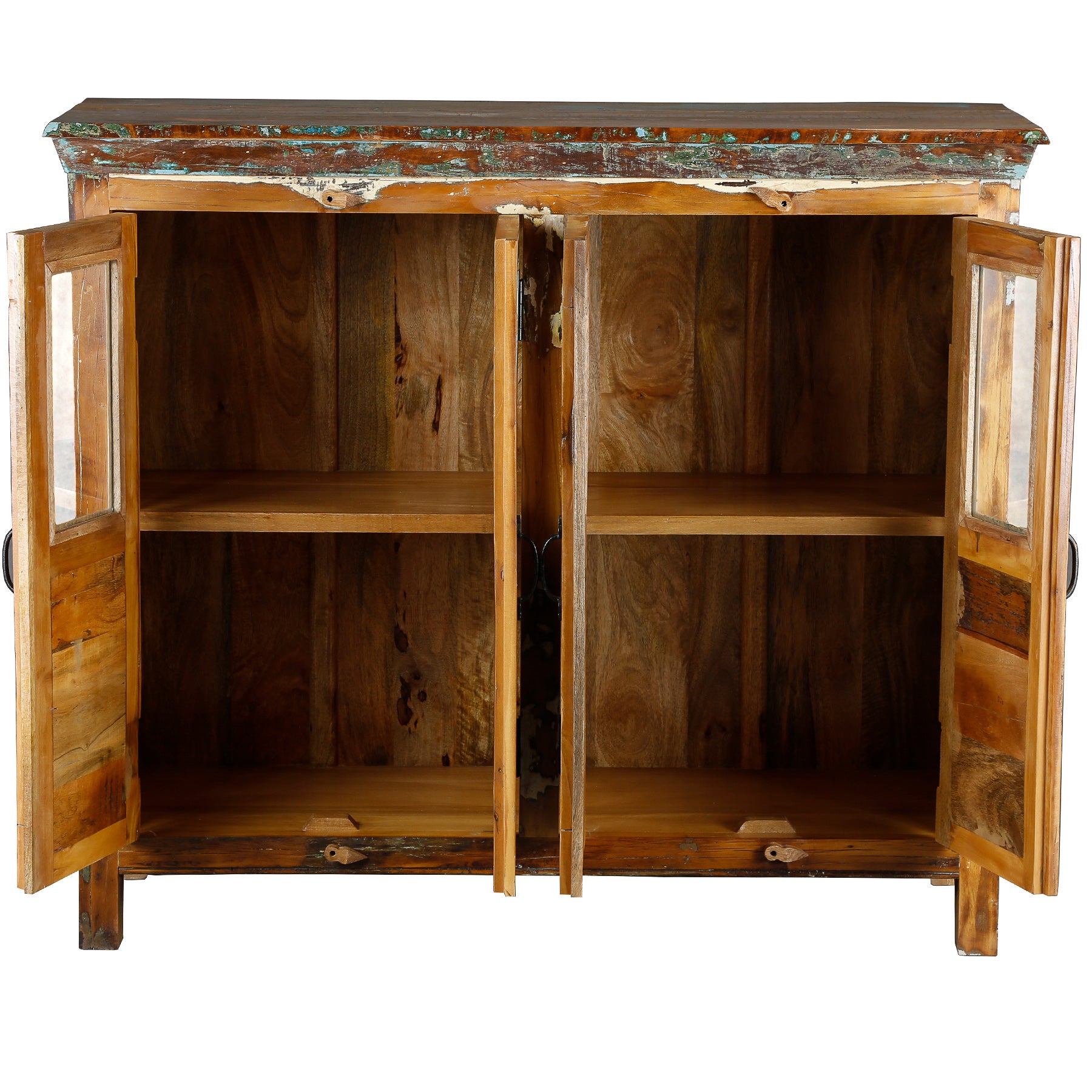 Fabriqué à partir de vieux bois de manguier, ce buffet est fabriqué à partir de bois déjà utilisé et en tire son caractère. Le matériau provient d'arbres tombés, de vieux bateaux et de poutres, de planchers et de poutres de support provenant de bâtiments démolis. Les traces, nuances de couleurs et petites irrégularités restent visibles et donnent au bois massif une profondeur impossible à reproduire.
