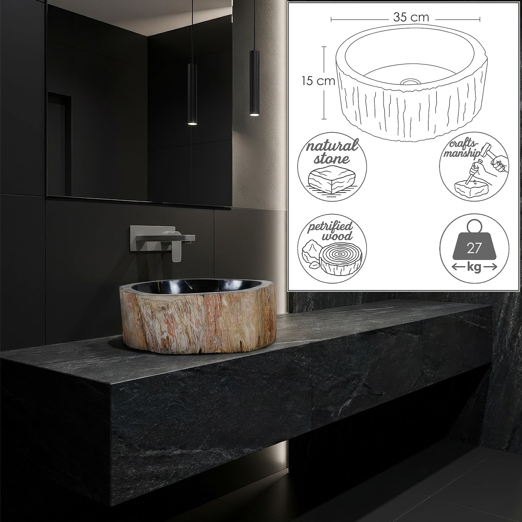 Le bois fossile porte les traces d'un changement extraordinaire : au cours de millions d'années, les structures autrefois organiques du tronc de l'arbre ont été silicifiées et préservées de manière permanente. La forme extérieure montre toujours la structure authentique et verticale de l'écorce, tandis que l'intérieur apparaît sombre, doucement poli et élégamment brillant. Cette combinaison d'histoire naturelle vécue et de surface fine fait de ce lavabo à poser un accroche-regard impressionnant - dans les salles de bains modernes, les toilettes d'invités ou les chambres d'inspiration spa.
