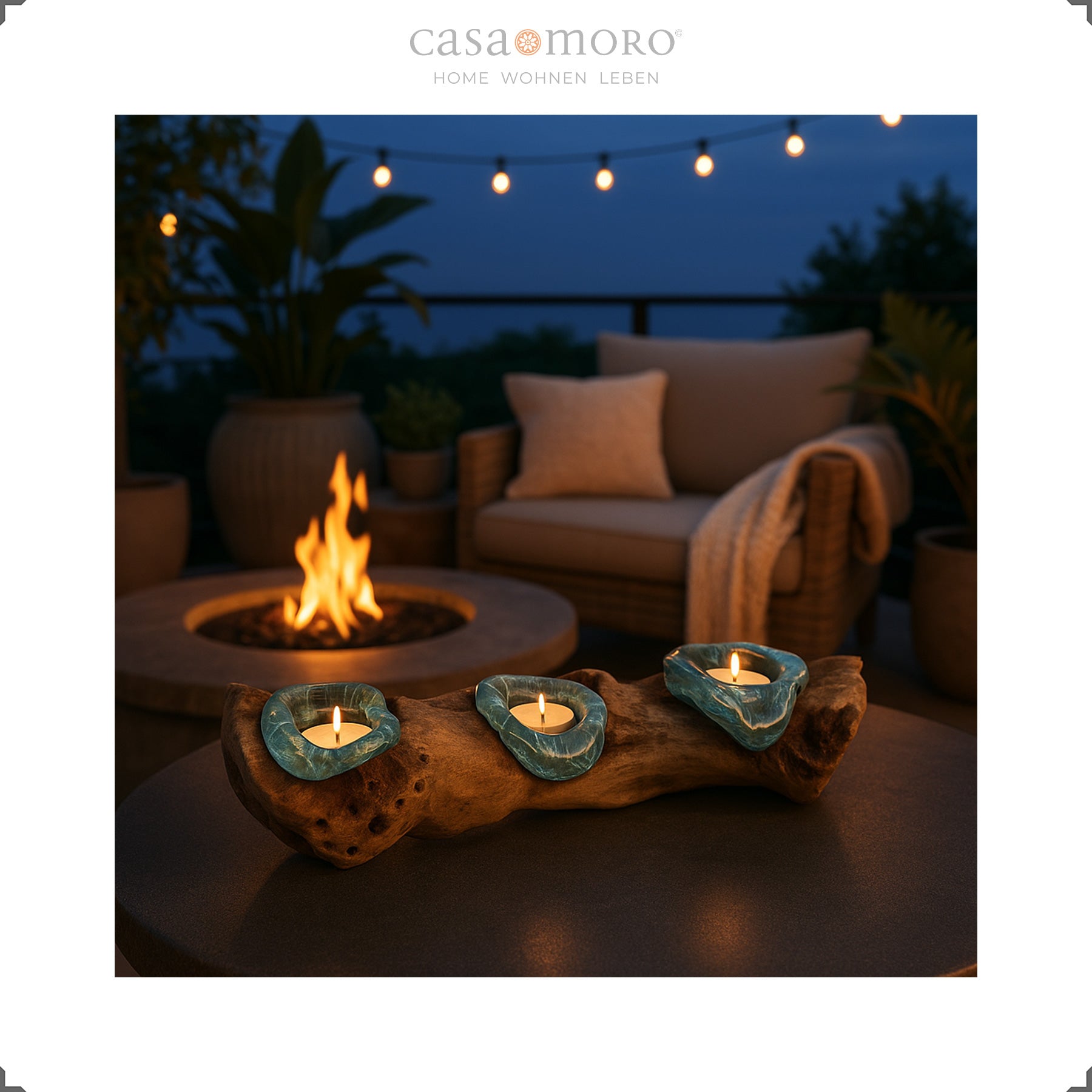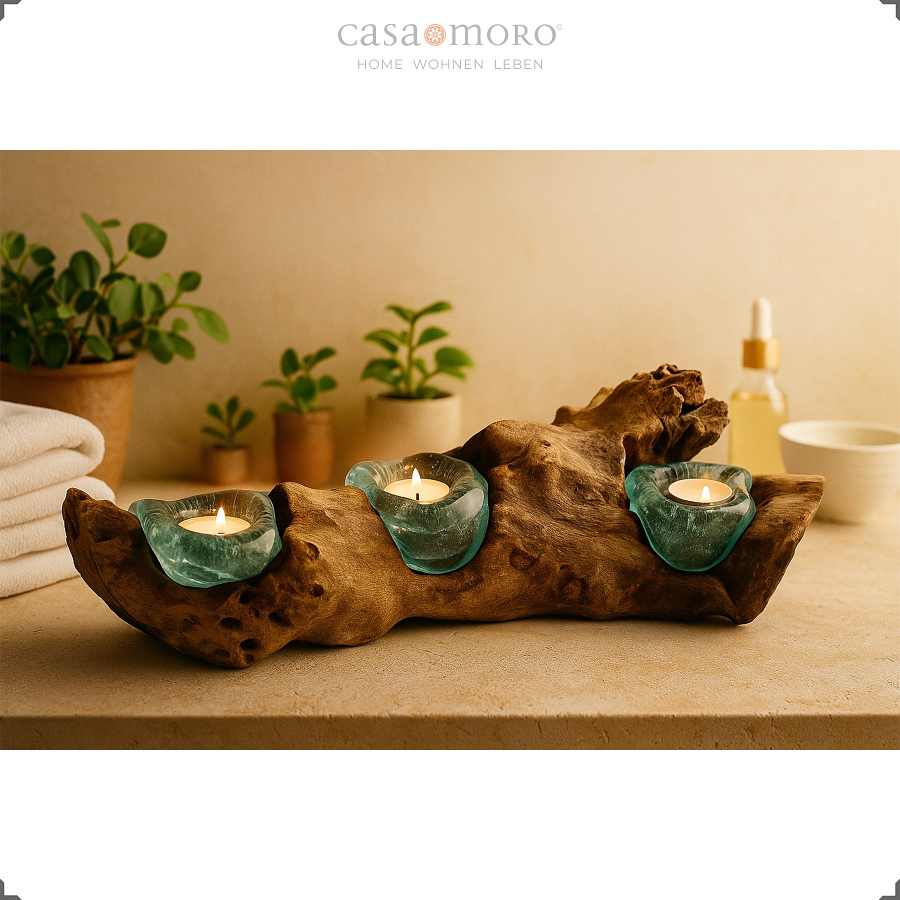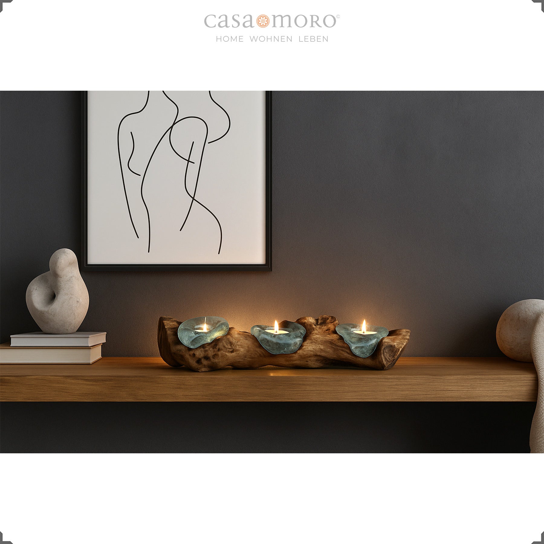 Les supports en verre sont placés à chaud directement sur le tronc de teck et épousent ses lignes organiques. Le résultat est un bougeoir en verre et en bois où chaque courbe, chaque creux et chaque arête du bois de racine reste visible. La lumière des bougies se reflète dans le verre, glisse sur la coque en bois et crée une atmosphère calme et accueillante.