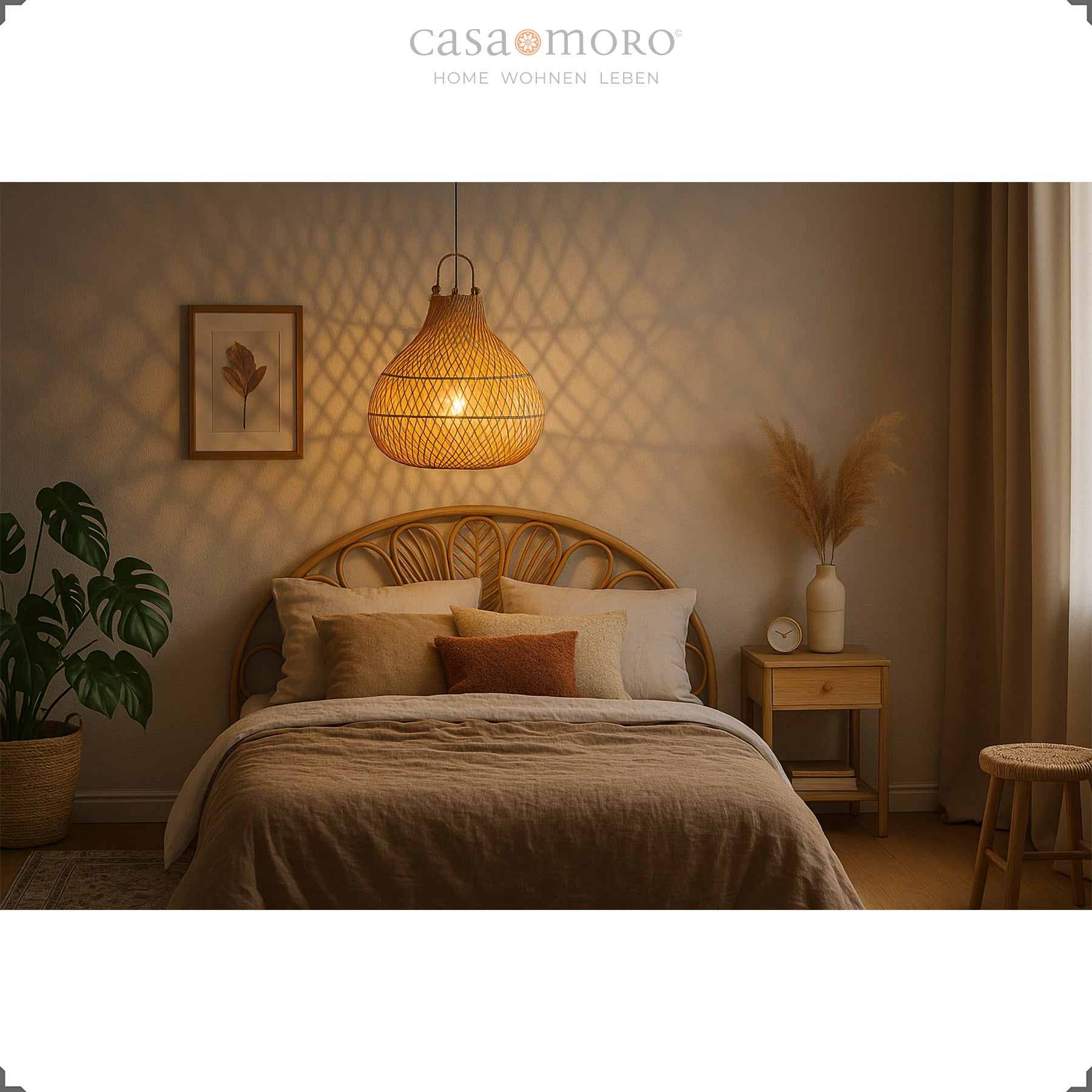 Natürliche Rattanlampe über Bett im Schlafzimmer mit warmem Licht und heller Einrichtung
